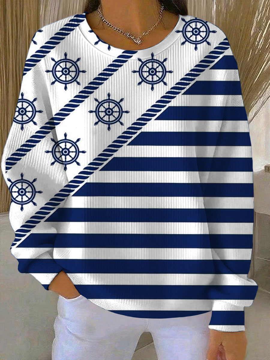 Damska bluza w kolorze białym i niebieskim w paski w stylu morskim z wzorami kół okrętowych