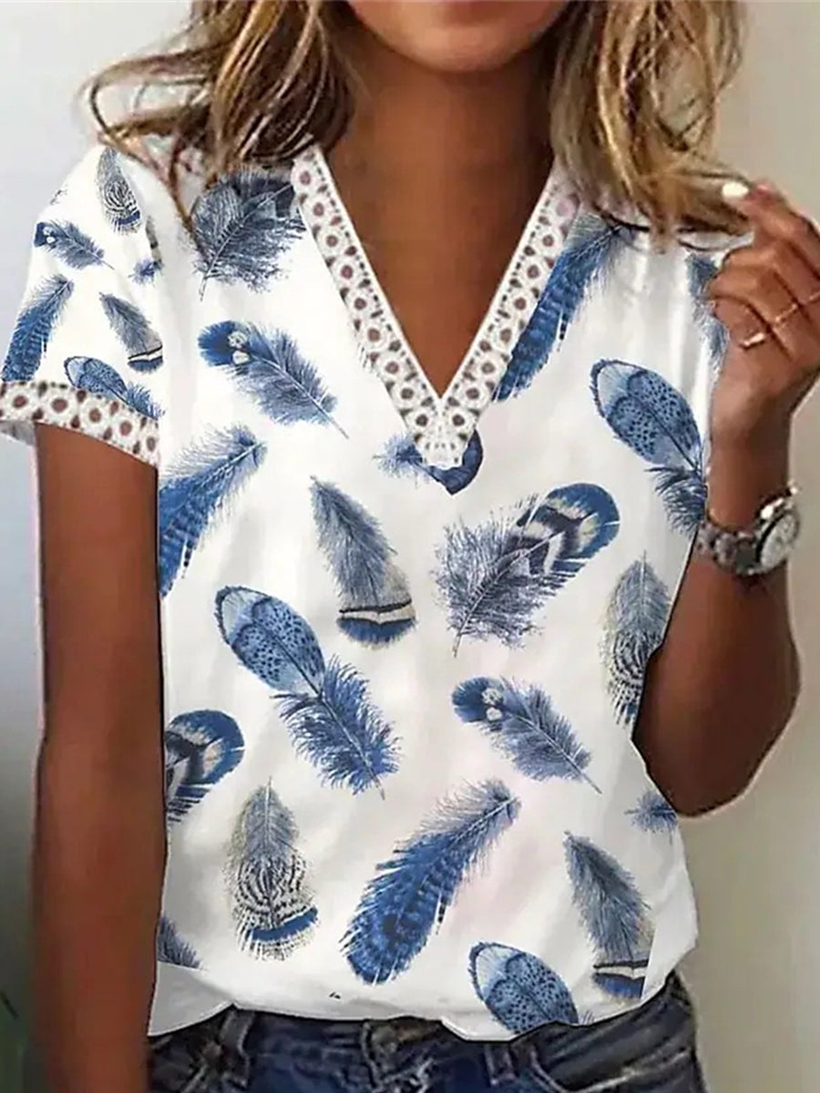 Damska casualowa koszulka z krótkim rękawem w szpic z dekoltem w szpic