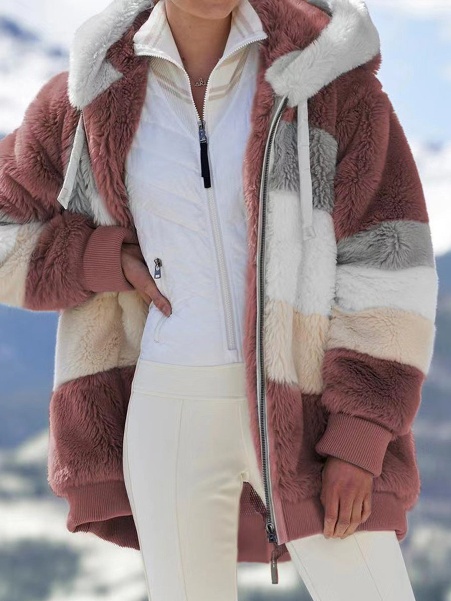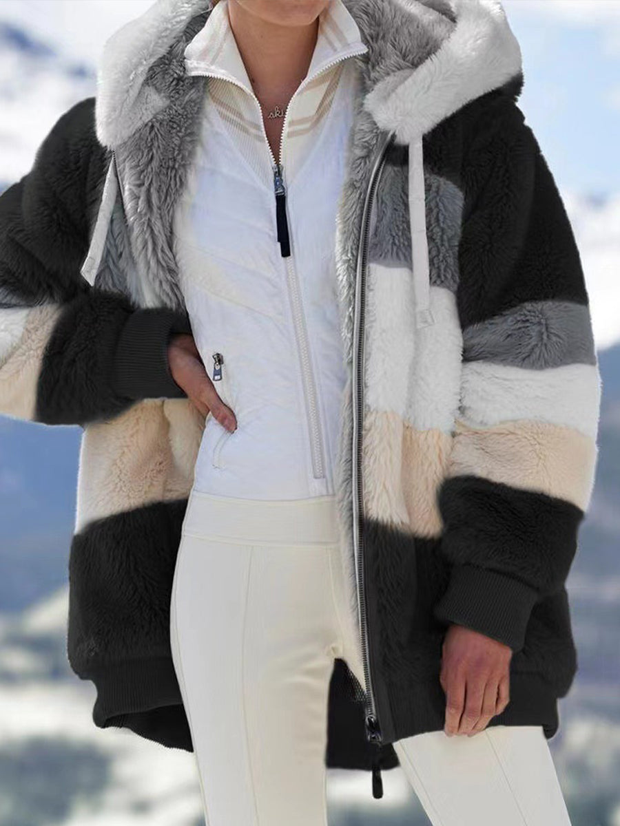 Damska ciepła pluszowa patchwork zapinana kieszonkowa luźna kurtka z kapturem