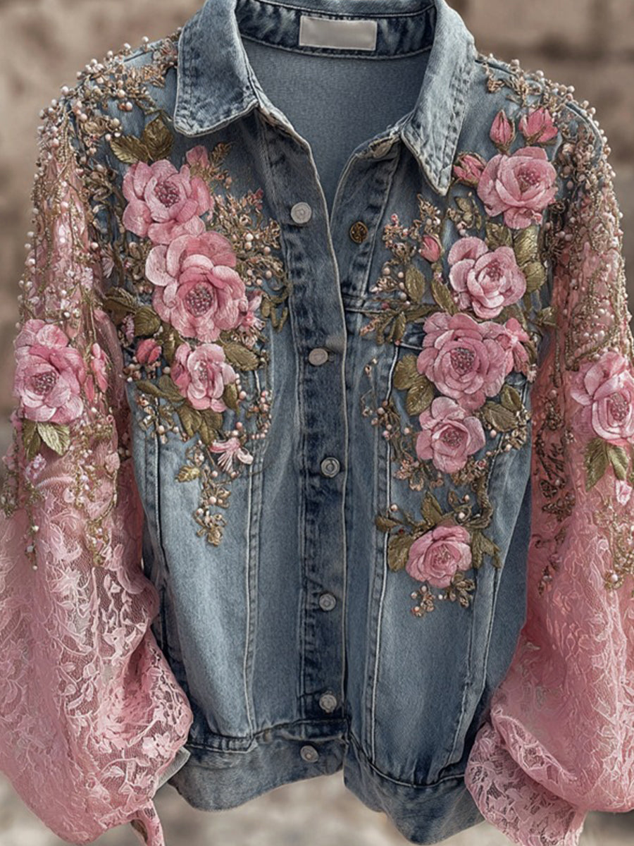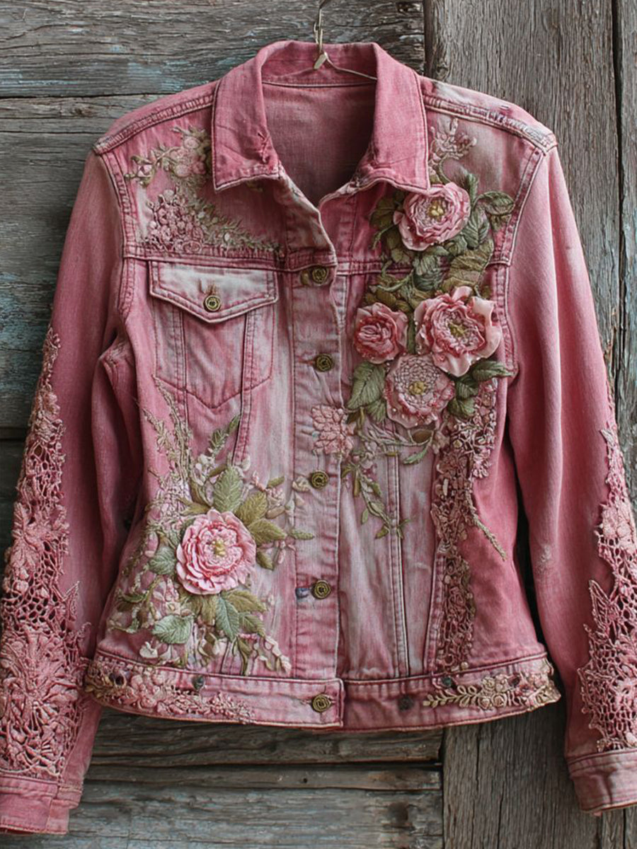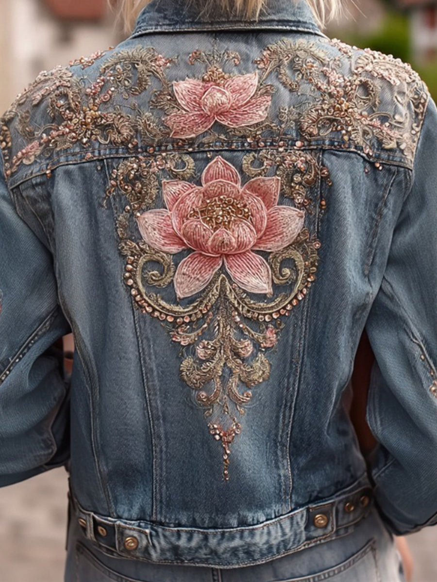 Damska kurtka dżinsowa w stylu vintage w stylu kwiatowym
