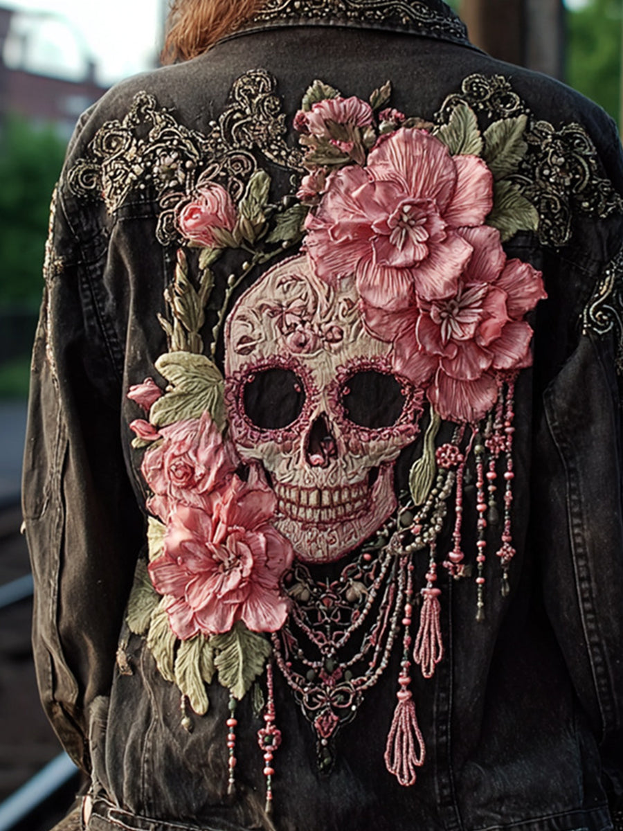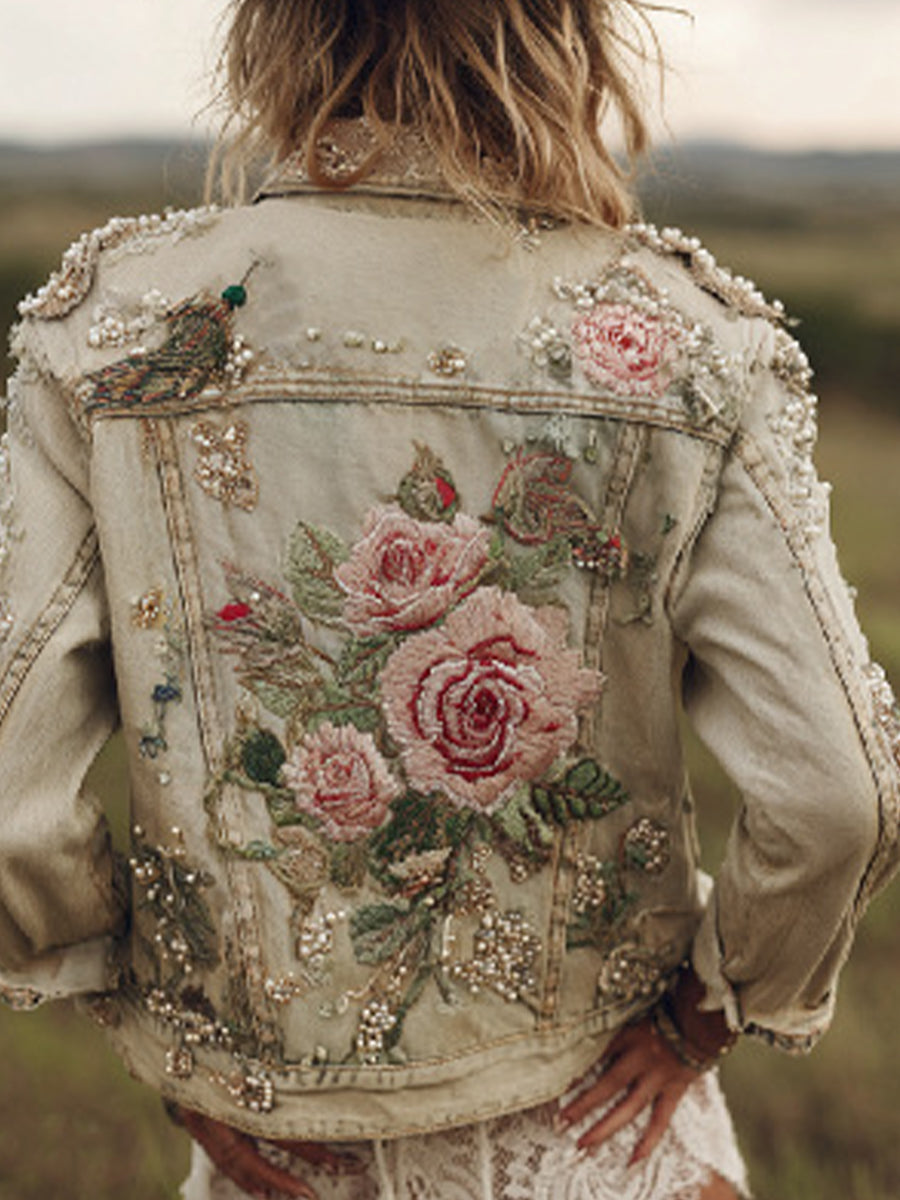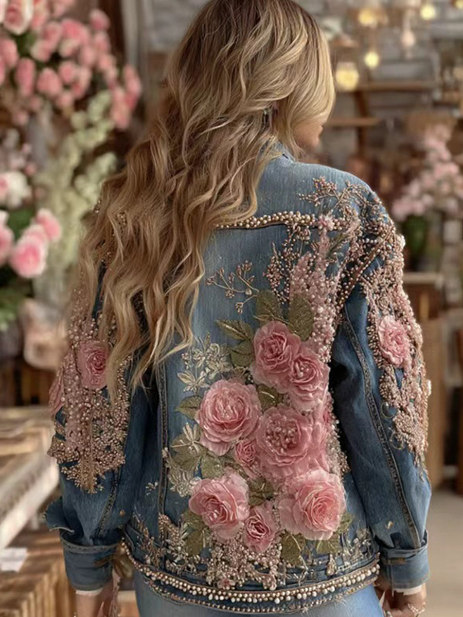 Damska kurtka dżinsowa w stylu vintage w stylu kwiatowym