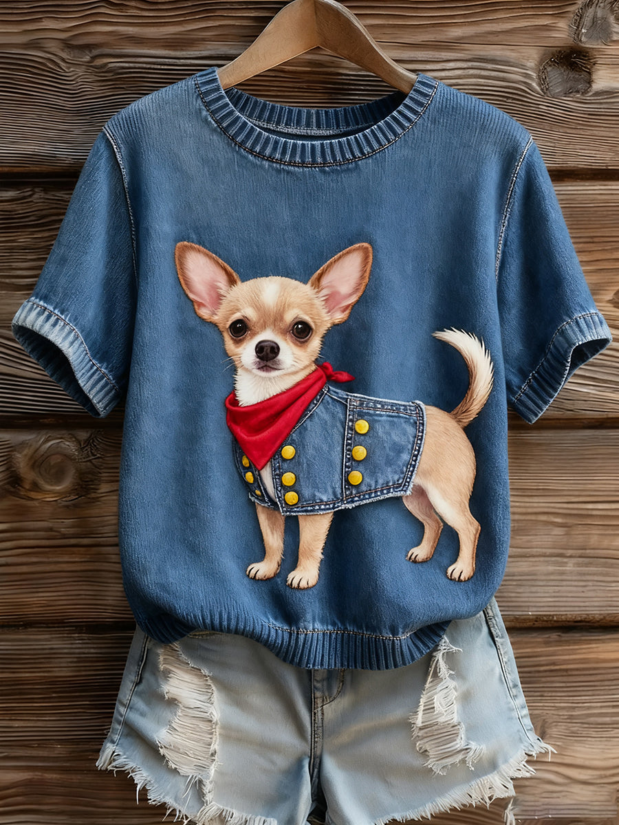 Damski artystyczny nadruk zwierzęcy wygodny top z dzianiny z krótkim rękawem