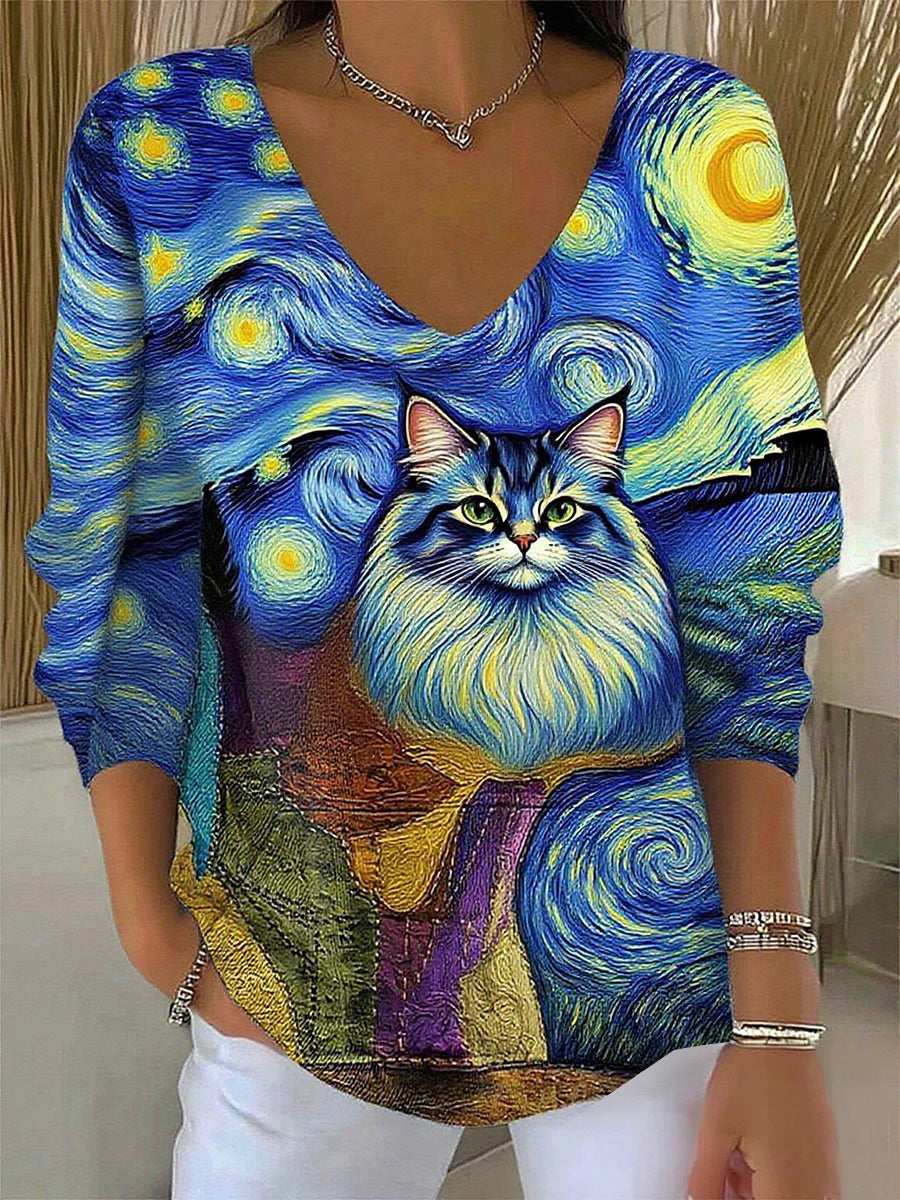 Damski retro zwierzęcy nadruk casualowy top z długim rękawem