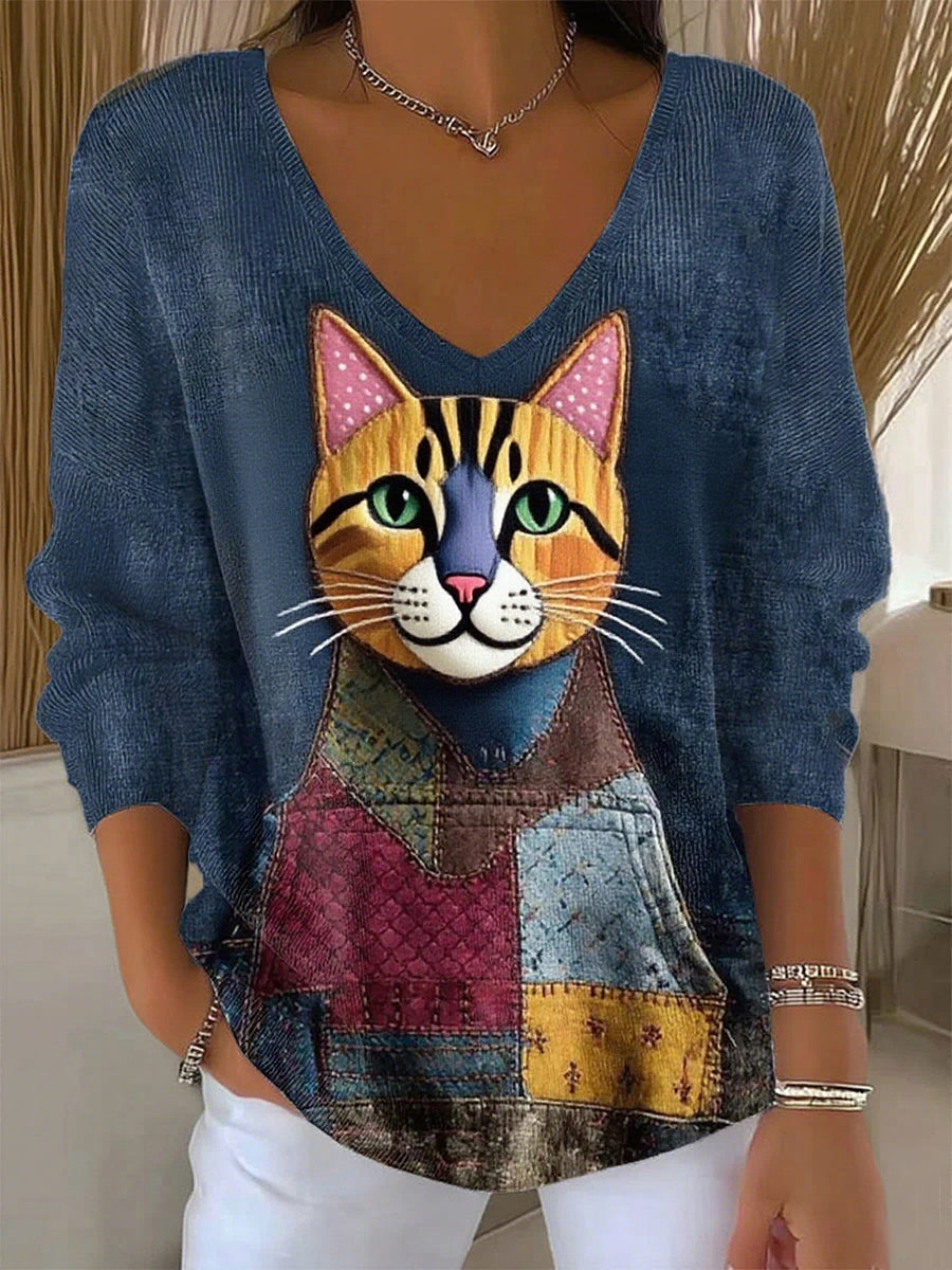 Damski retro zwierzęcy nadruk casualowy top z długim rękawem