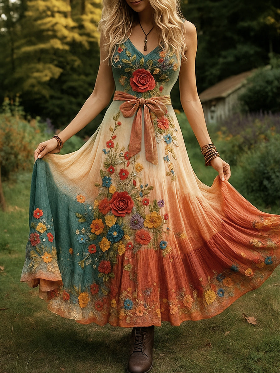 Retro wiejska sztuka kwiatowa z nadrukiem Vintage dekolt w szpic bez rękawów wygodna sukienka maxi