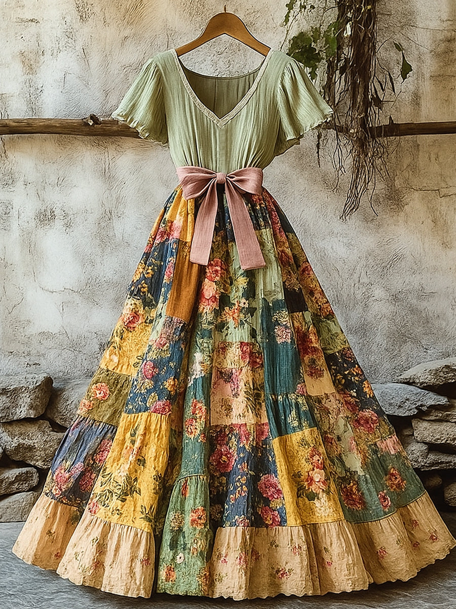 Damska retro wiejska kwiecista sukienka z nadrukiem w szpic z krótkim rękawem bawełniana sukienka maxi