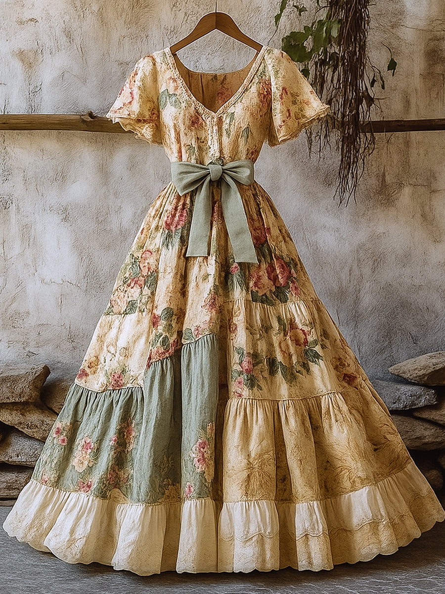 Damska retro wiejska kwiecista sukienka z nadrukiem w szpic z krótkim rękawem bawełniana sukienka maxi