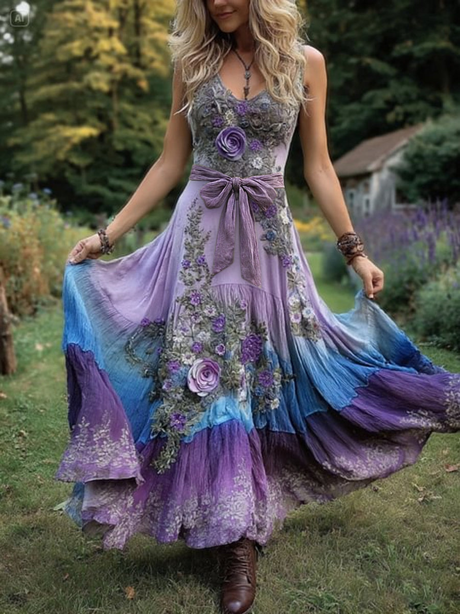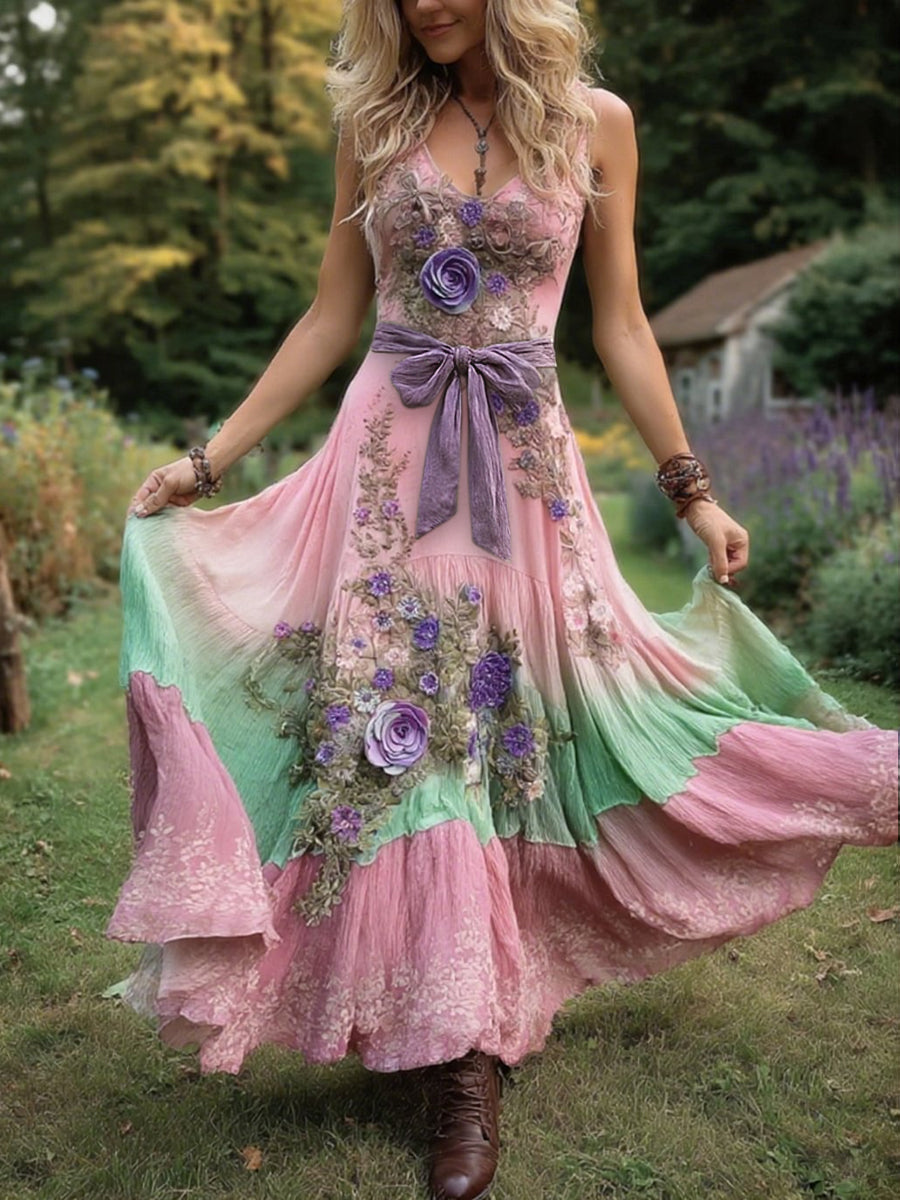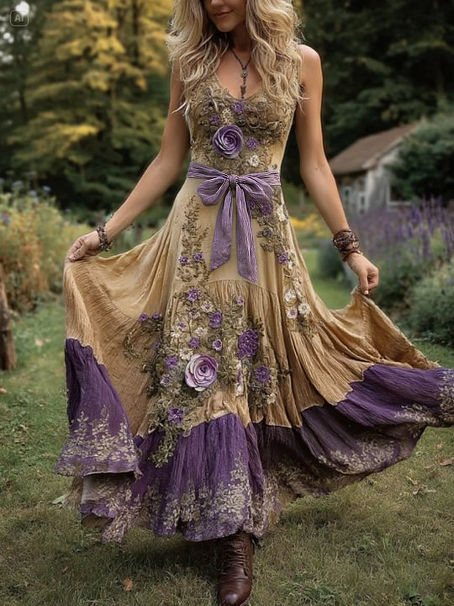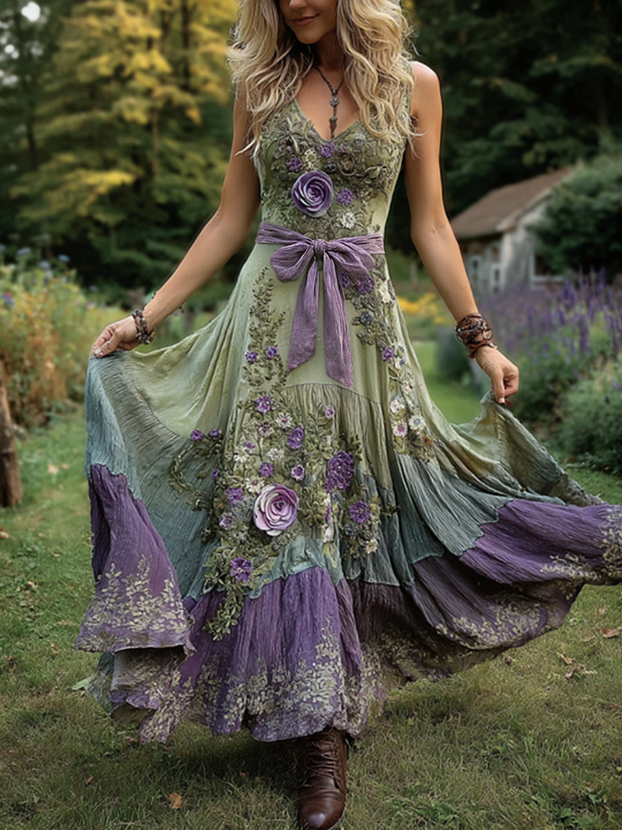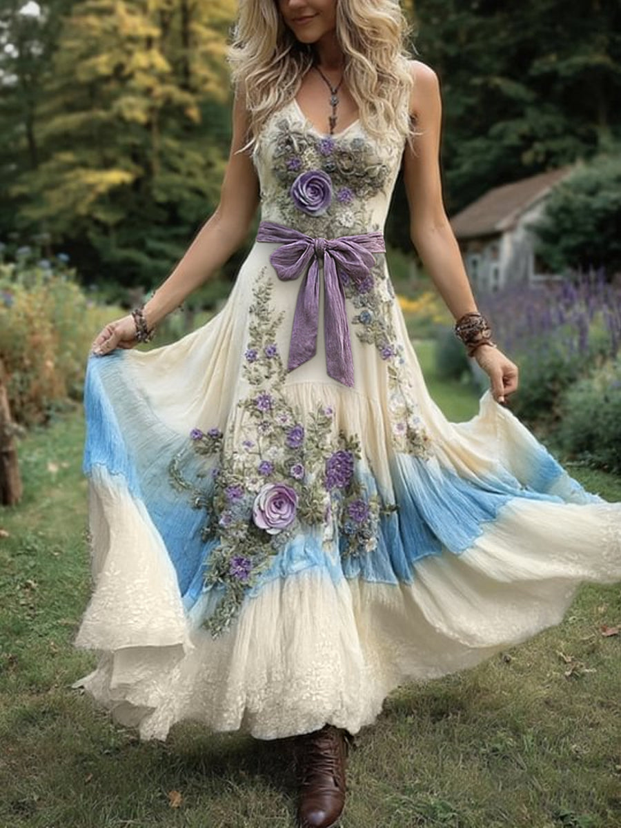 Retro wiejska sztuka kwiatowa z nadrukiem Vintage dekolt w szpic bez rękawów wygodna sukienka maxi