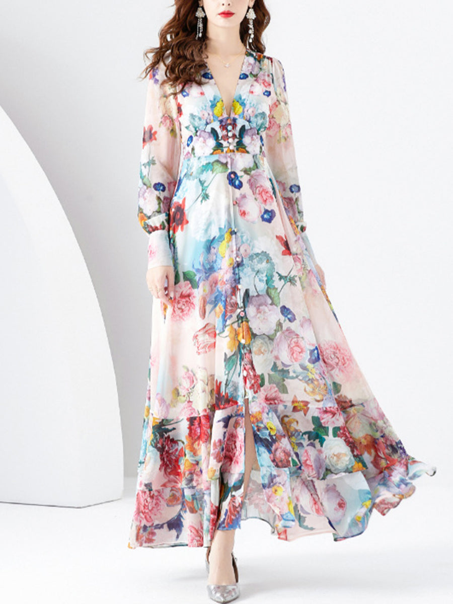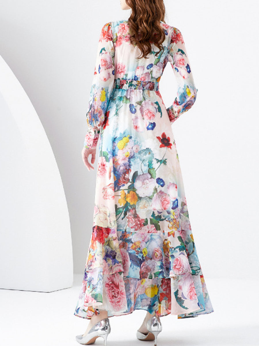 Elegancka szyfonowa szyfonowa sukienka z długim rękawem z nadrukiem w kształcie litery V