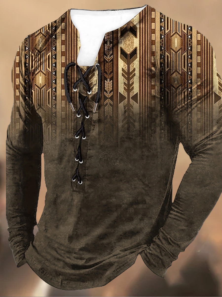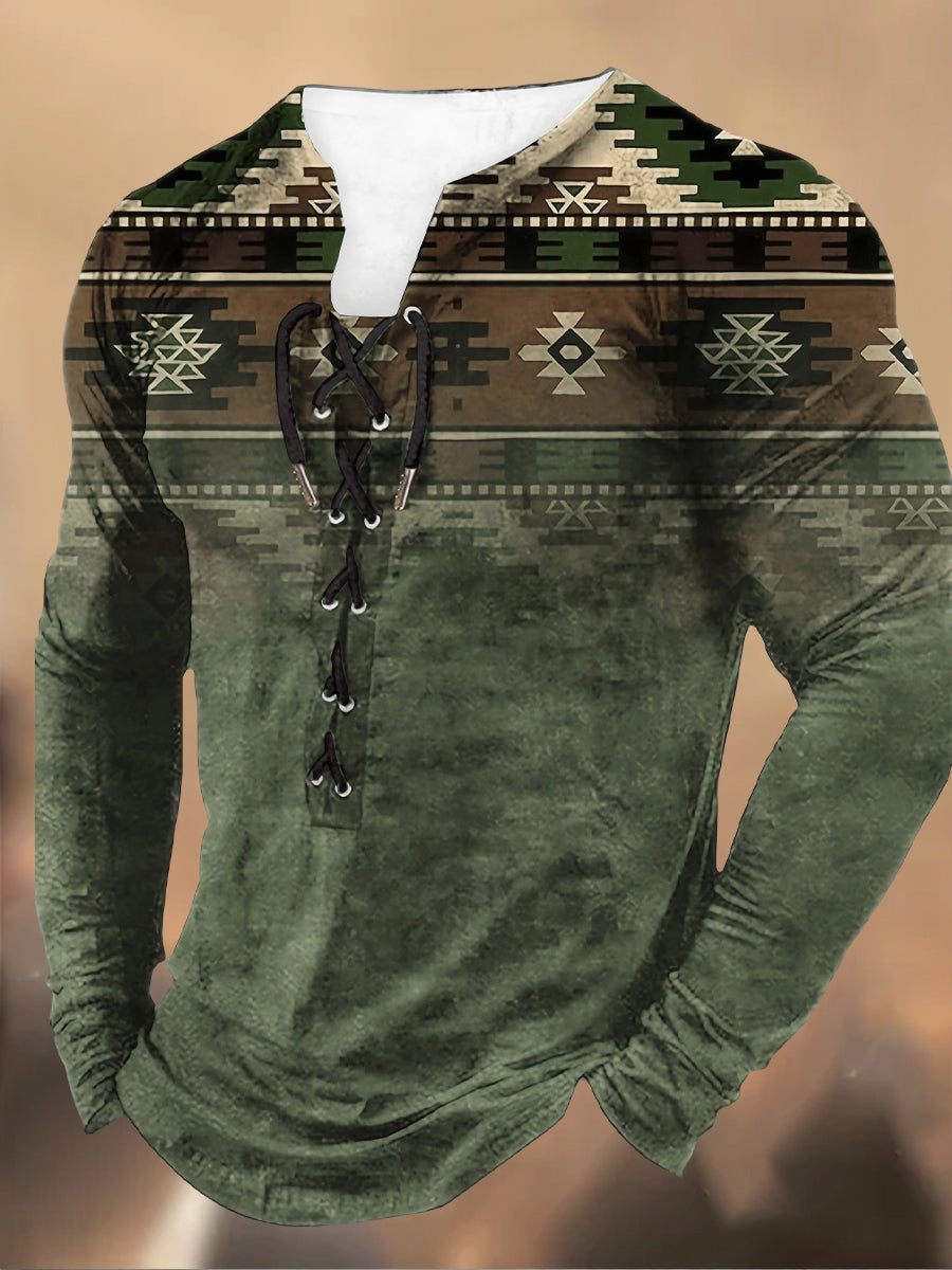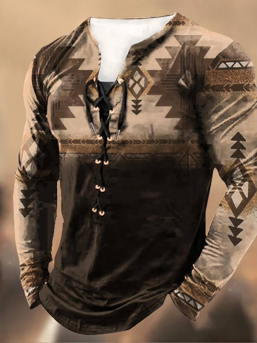 Męska koszulka z długim rękawem w stylu retro z wysokim dekoltem w stylu zachodnim