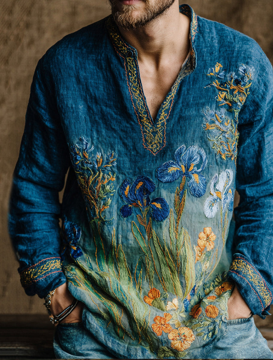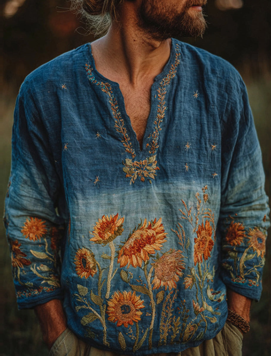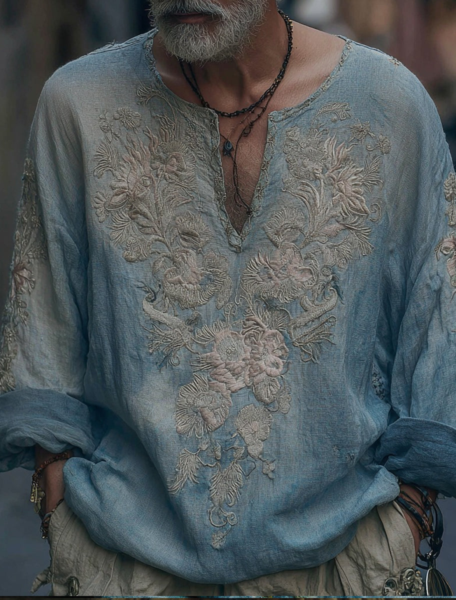 Męska koszulka z długim rękawem w stylu retro z wysokim dekoltem w stylu zachodnim