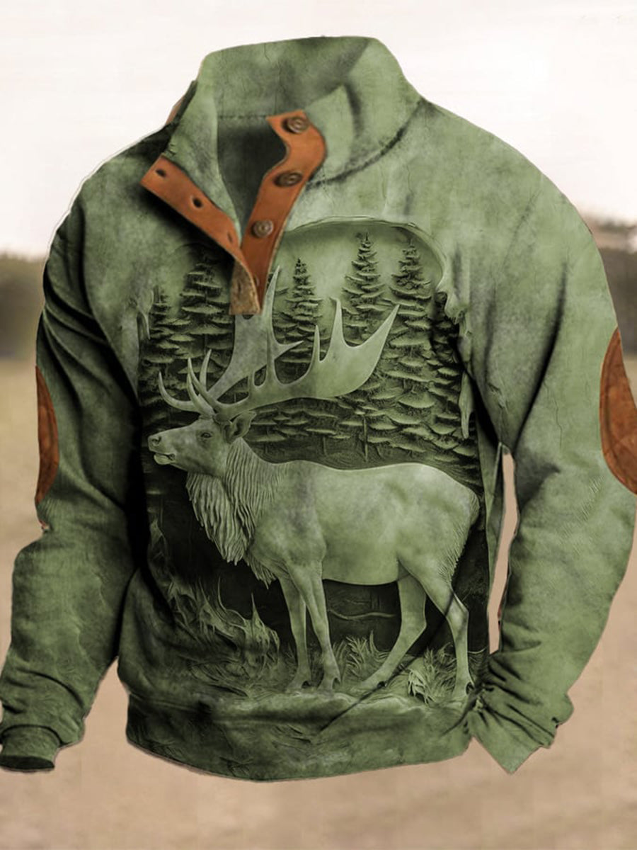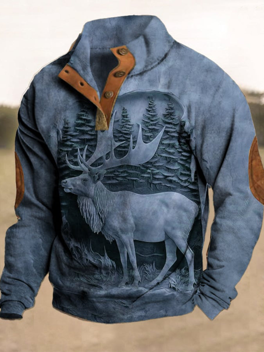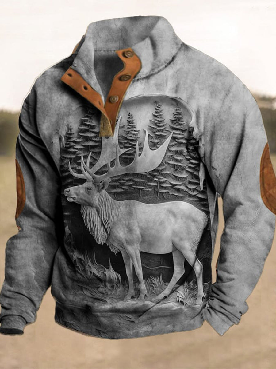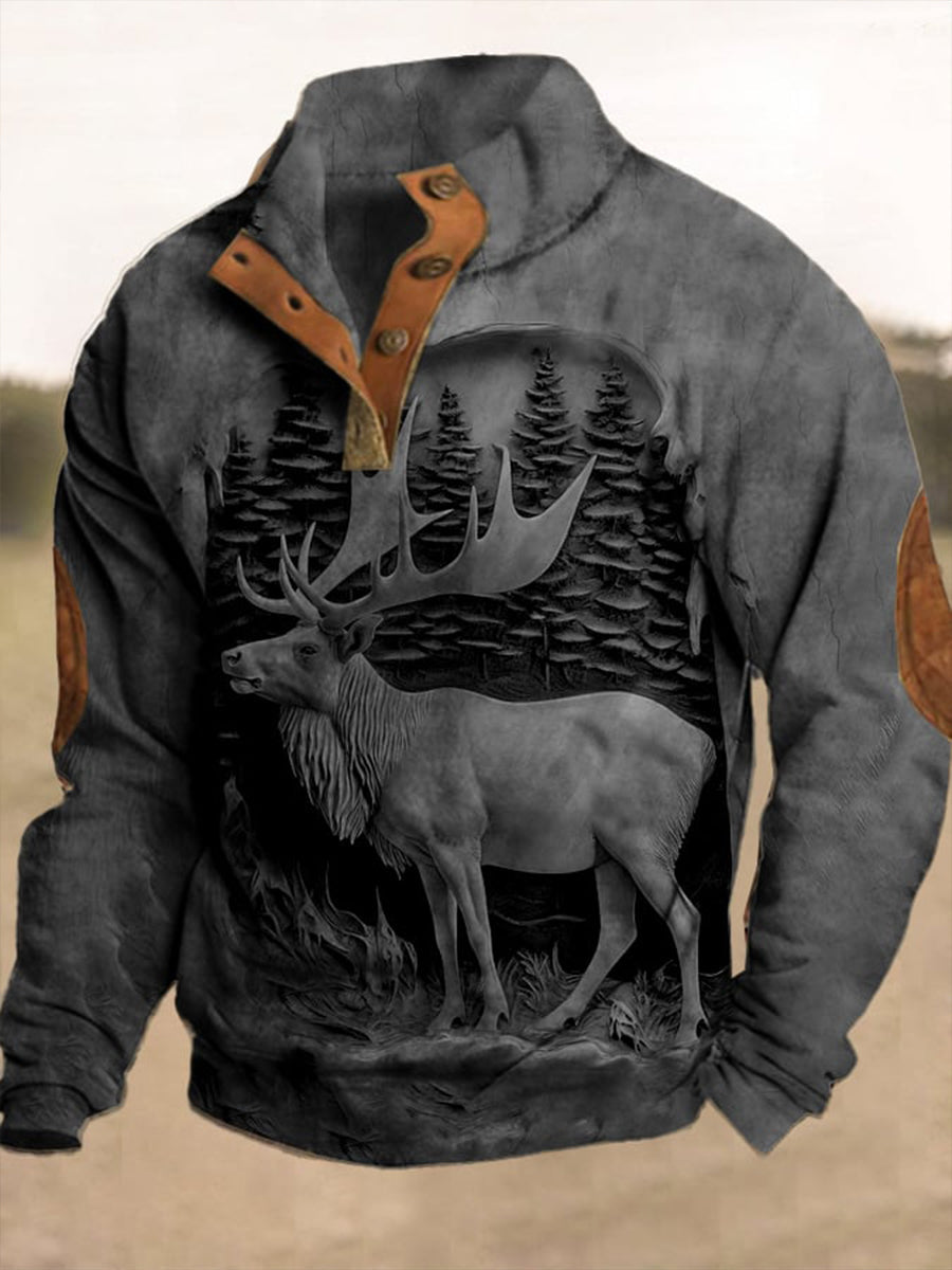 Męski Western Vintage Elk Relief Trójwymiarowy Nadruk Stand Collar Suwak Flush Outdoor Bluza