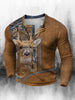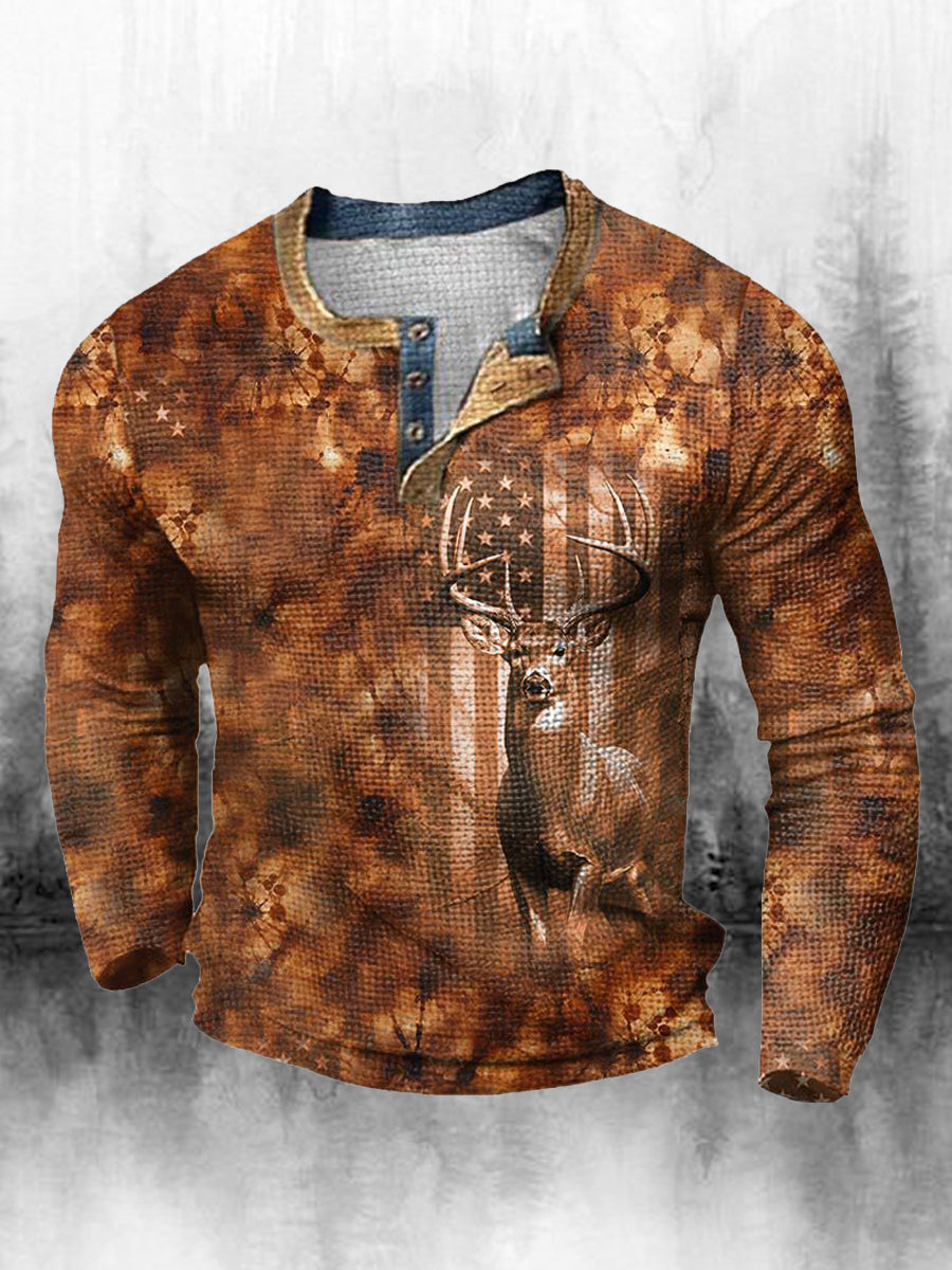 Męski golf z nadrukiem zachodnim w stylu retro luźny 3 guziki Henley Neck z długim rękawem