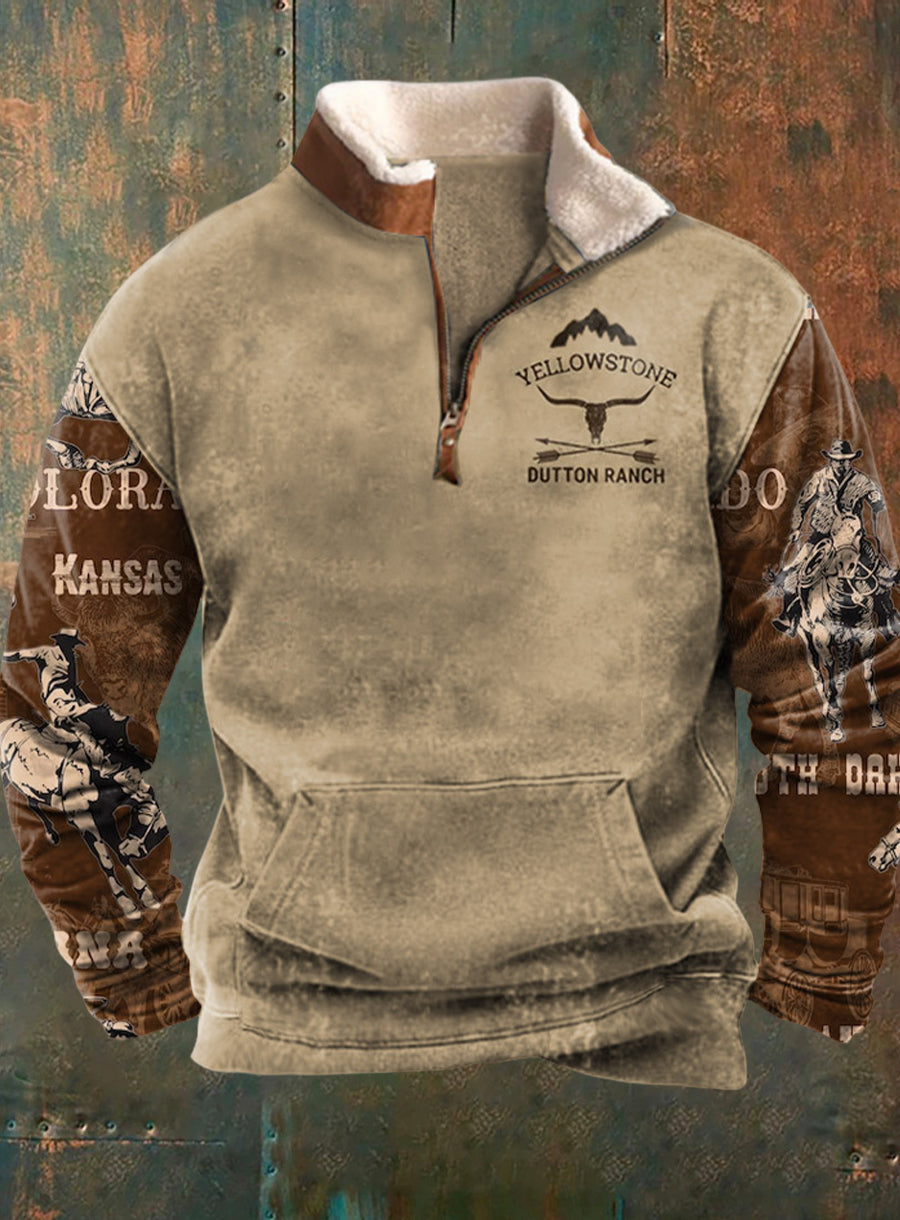 Męska koszulka z długim rękawem w stylu retro z wysokim dekoltem w stylu zachodnim