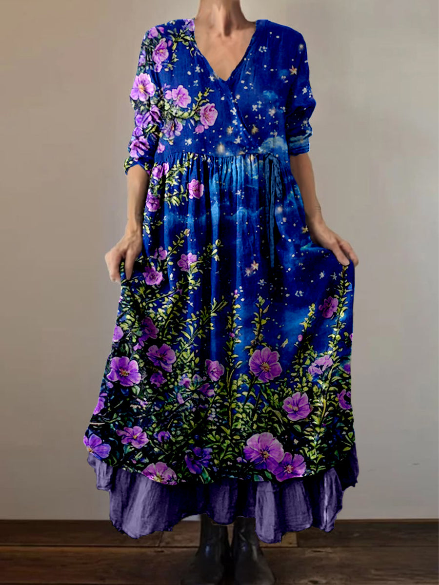 Retro Boho kwiatowy nadruk Vintage dekolt w szpic z podwójnym półrzędem bawełniana sukienka midi z długim rękawem