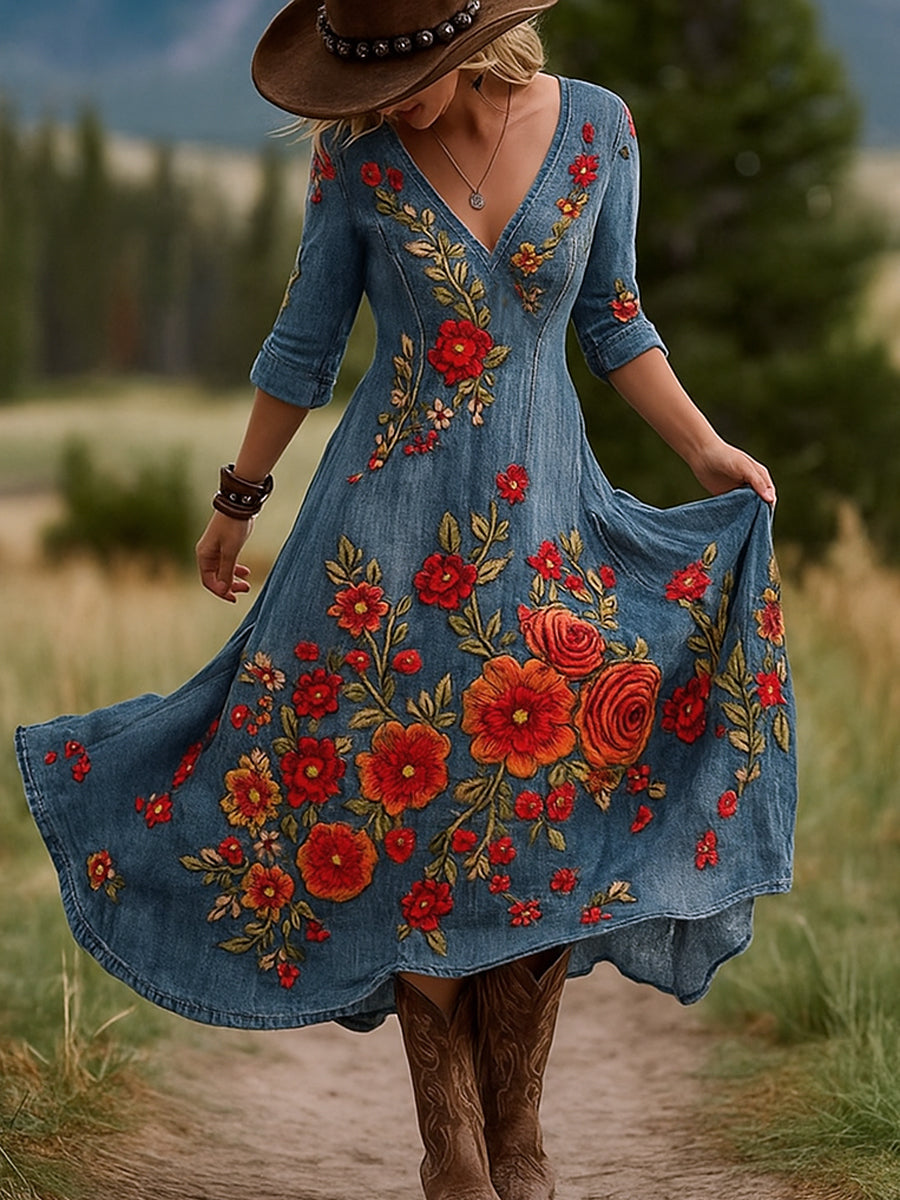 Retro kwiatowy nadruk w stylu vintage z dekoltem w szpic bawełniana sukienka maxi z długimi rękawami