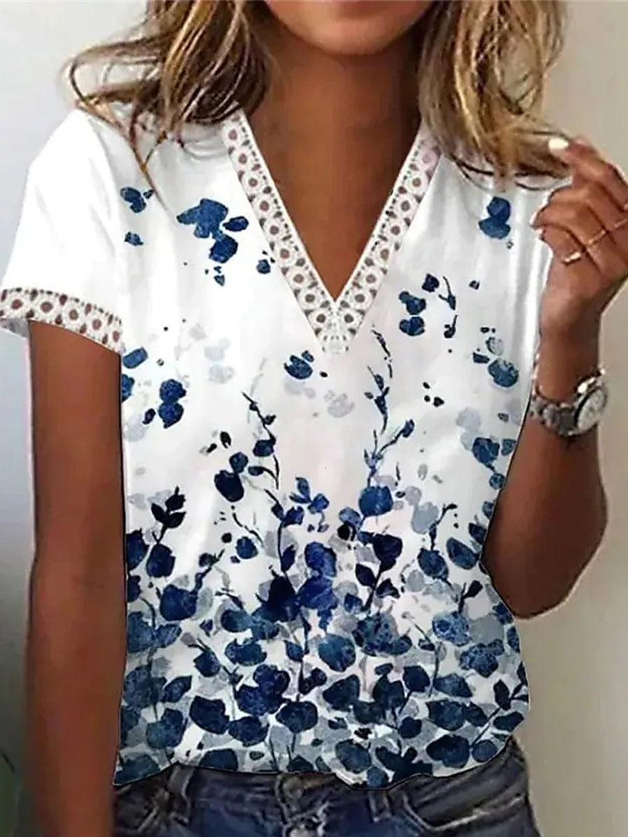 Damska koszulka z krótkim rękawem w kwiecisty dekolt w szpic
