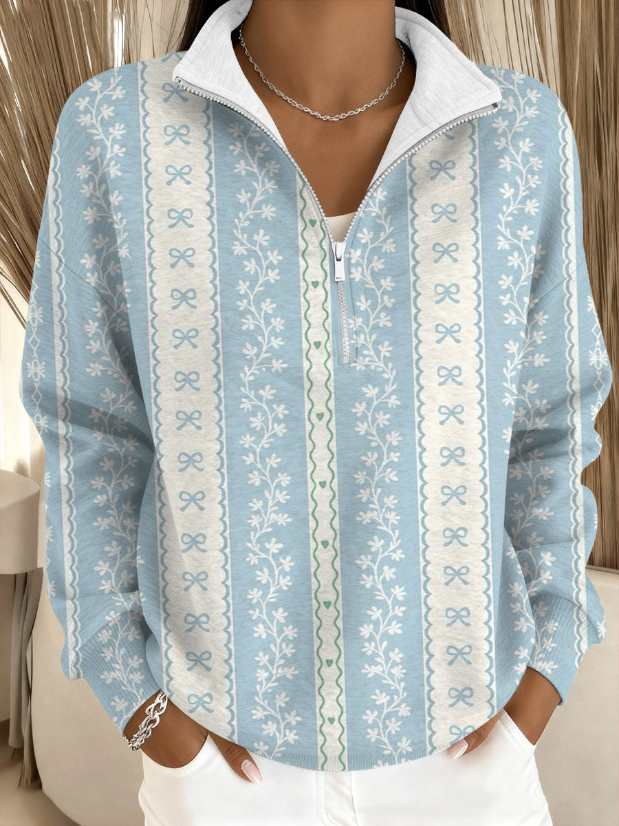 Damska bluza z delikatnym niebieskim kokardką i kwiatowym kołnierzem