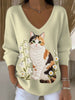 Damski słodki kot haftowany sweter z dekoltem w szpic